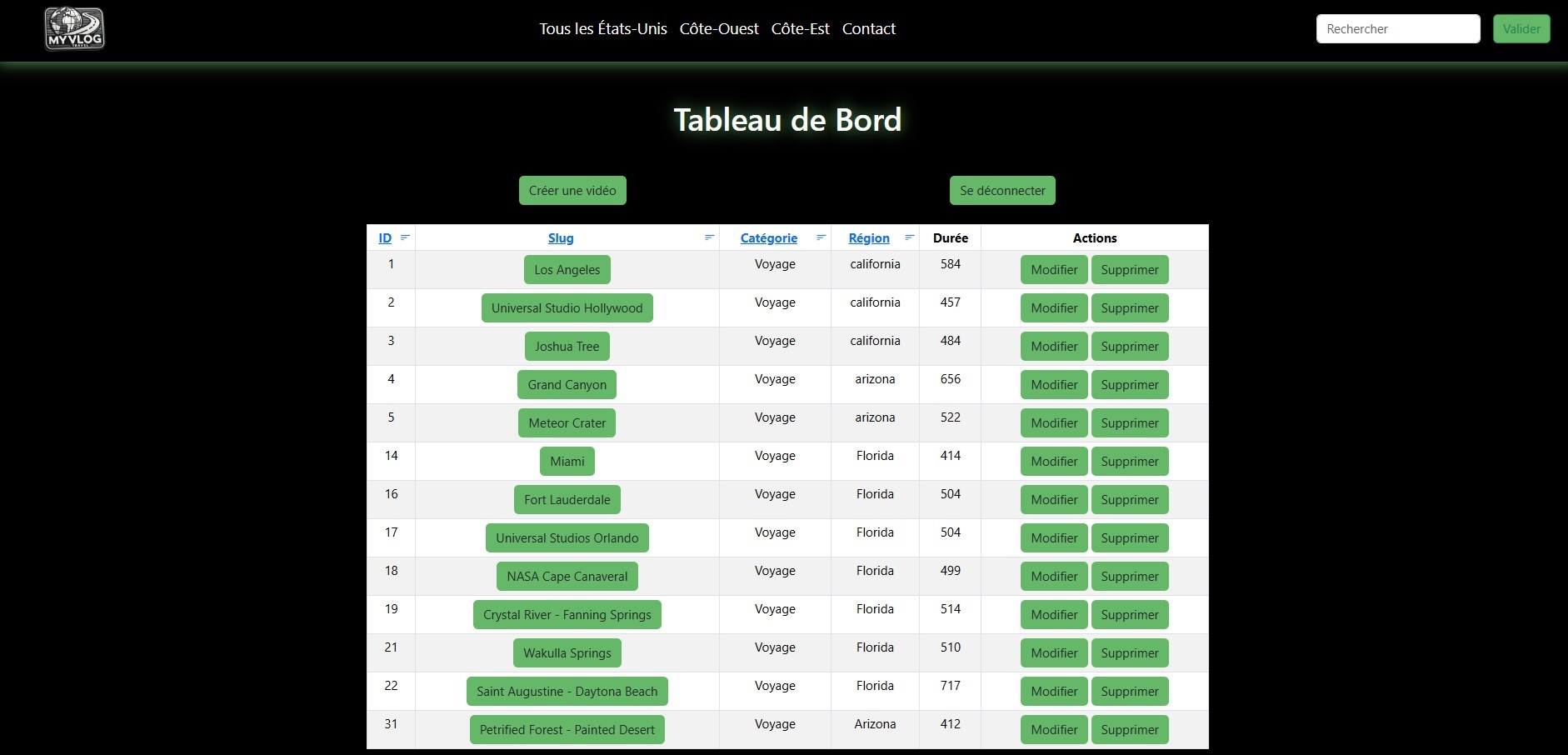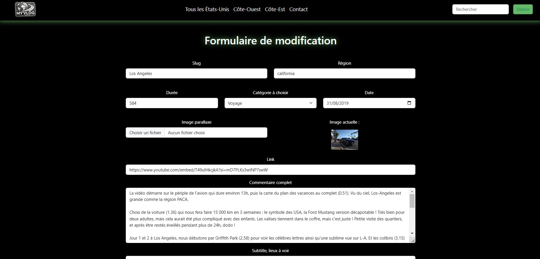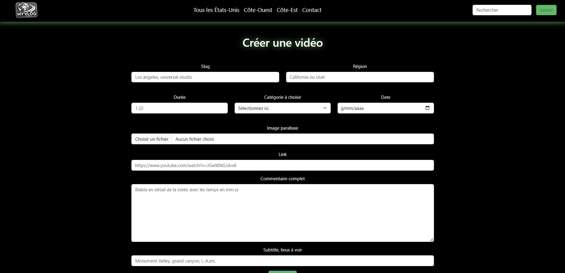 My Vlog est un site qui propose des vidéos, basé ici sur le thème du voyage. J'ai pour but de continuer d'apprendre les langages PHP ainsi que Symfony. Ce vlog est le moyen pour moi d'allier la continuité de ma formation en développement web et ma passion pour les USA. Le code source du site est consultable à cette adresse : https://github.com/Sandra-Rocher/My_Vlog