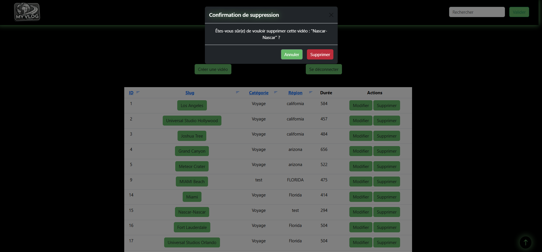 Image 4 : Dashboard - Supprimer une vidéo : Un pop-up en Bootstrap viendra demander la confirmation de la suppression.